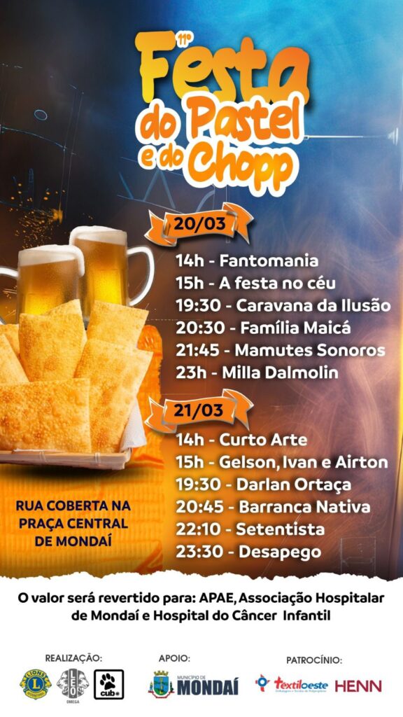 O Lions Clube, Leo Clube Ômega Mondaí e Clube do Leãozinho, juntamente com demais parceiros, estão organizando para esta sexta-feira, dia 20 e no sábado dia 21 de março, mais uma edição da tradicional Festa do Pastel e do Chopp.