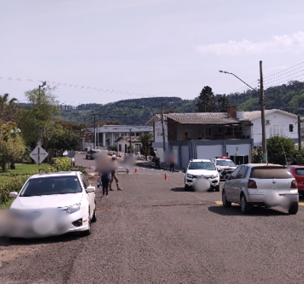 A guarnição foi acionada pelo Corpo de Bombeiros Militar e, ao chegar ao local, conversou com a motorista de um veículo Renault/Sandero, que relatou estar trafegando pela Rua Schiller, no sentido centro, quando uma motocicleta Honda/CG 150 Titan KS, que transitava pela Rua Hubert Weiss, entrou na via e colidiu na lateral de seu carro.