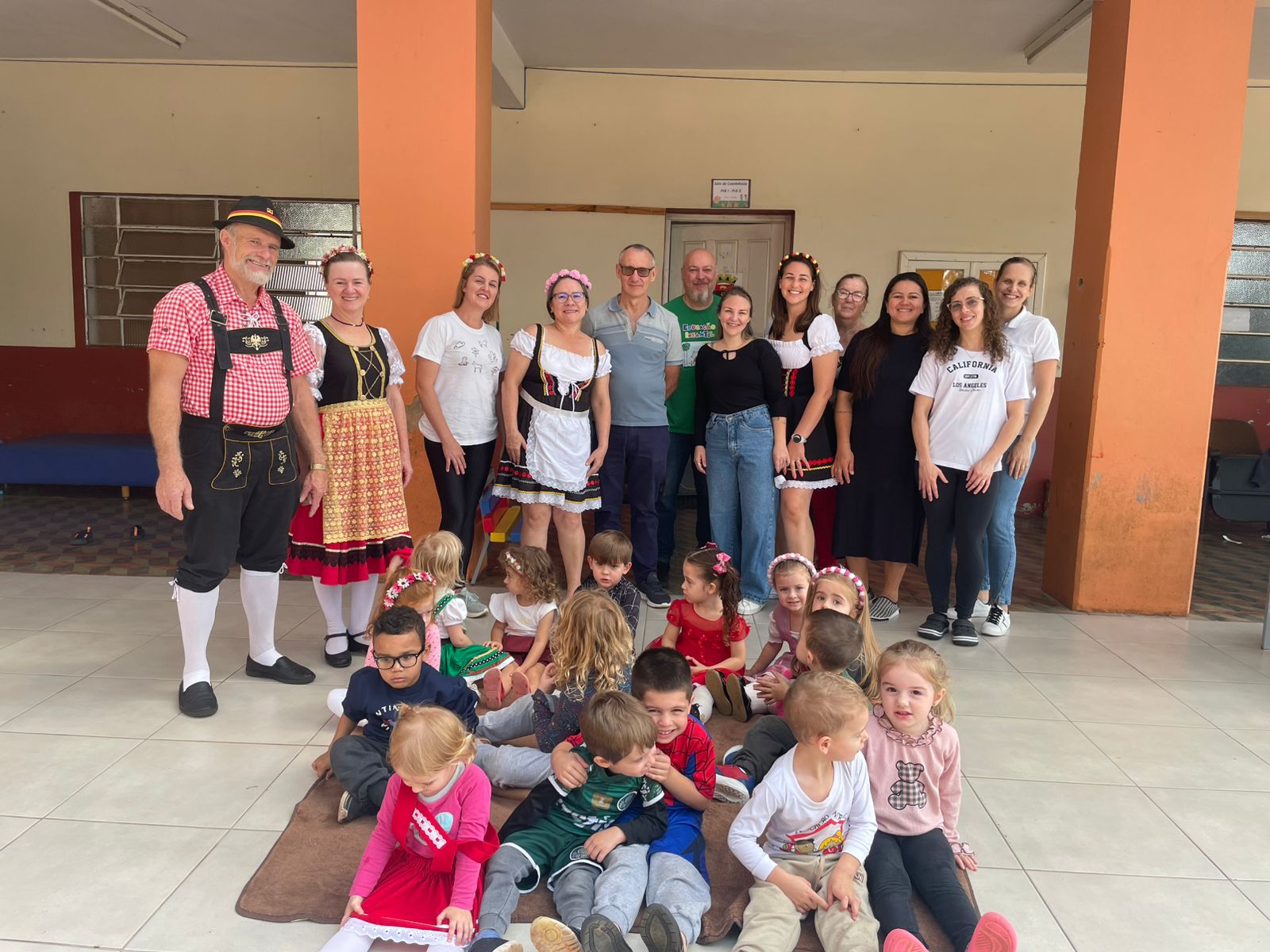 A programação incluiu a oferta de pratos característicos, entre eles strudel de maçã com aveia, repolho cozido, linguiça com pão e suco. O evento contou com a presença de Fritz e Frida, representados por Marino e Lucia Anschau, avós de uma criança da unidade, além do Secretário de Educação, João Kessler.