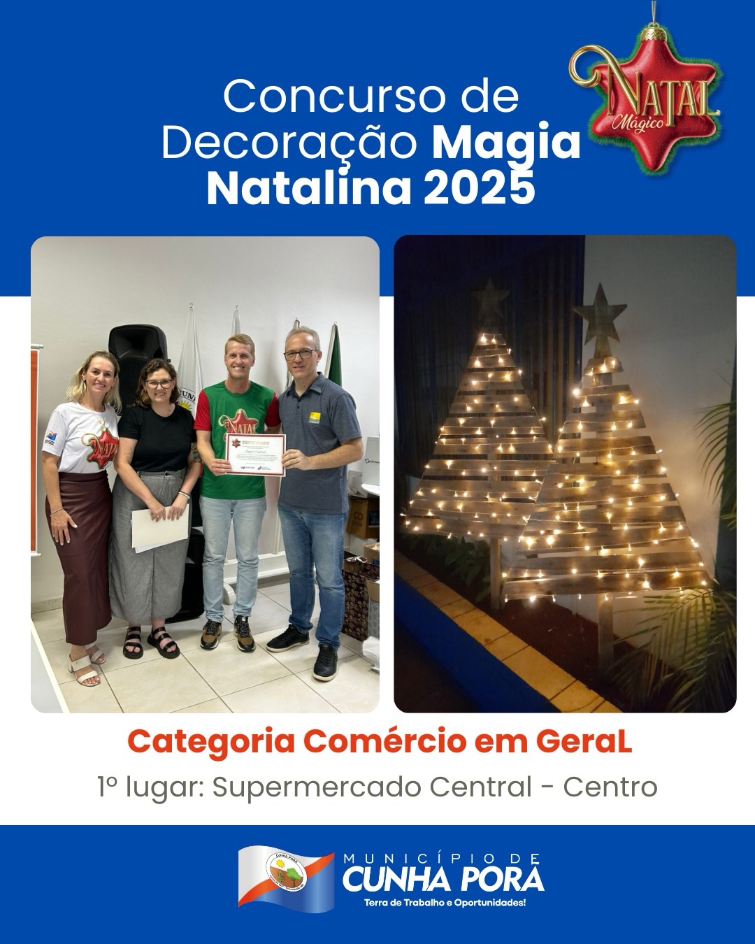 Na noite de 26 de dezembro, foram divulgados os vencedores do Concurso de Decoração “Magia Natalina 2025”, realizado no município de Cunha Porã. A iniciativa contou com a participação de 10 inscritos, distribuídos em três categorias: Comércio em Geral, Residencial Urbano e Residencial Rural.