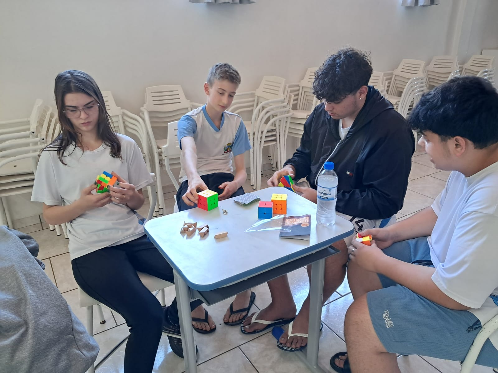 Em vez das telas, os intervalos agora são preenchidos com desafios de raciocínio e estratégia. A equipe pedagógica, após um cuidadoso planejamento, adquiriu uma variedade de jogos de lógica, incluindo clássicos como a Torre de Hanói, Cadeado Cigano, Cubo Mágico e o Quebra-cabeça Pêndulo.