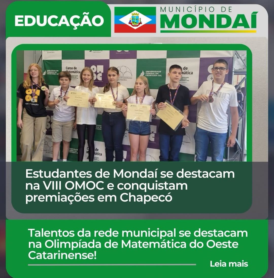 A rede municipal de ensino de Mondaí teve um sábado de orgulho e celebração com a premiação da VIII OMOC – Olimpíada de Matemática do Oeste Catarinense (UFFS 2025), realizada em Chapecó no dia 06 de dezembro. Nossos estudantes demonstraram dedicação, talento e grande desempenho, conquistando medalhas e menções honrosas nos níveis I e II da competição, representando com excelência as escolas do município.