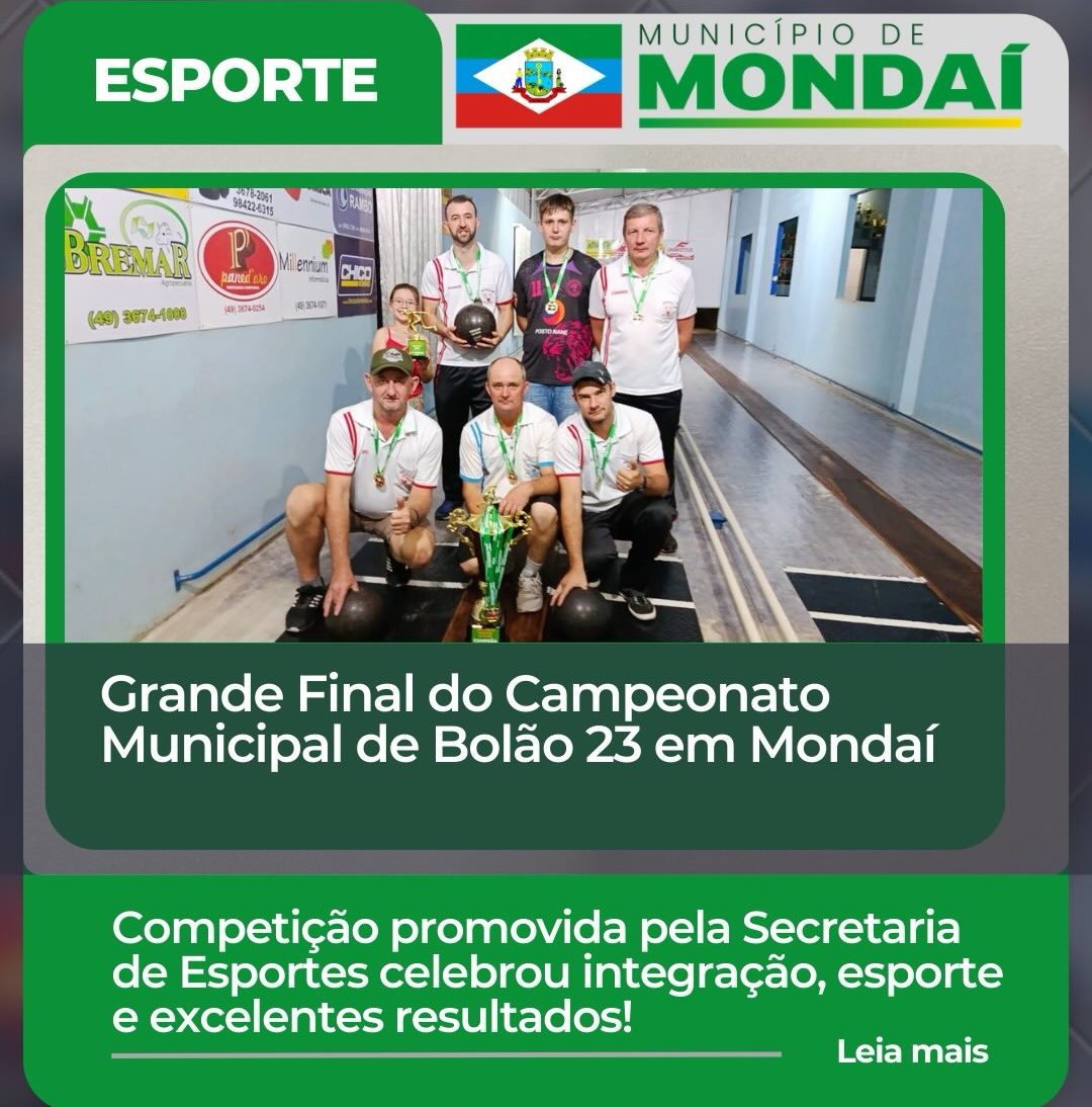 A Secretaria de Esportes, Juventude, Turismo e Lazer de Mondaí realizou, no último final de semana, a grande final do Campeonato Municipal de Bolão 23 – edição 2025, reunindo equipes e atletas que demonstraram talento, dedicação e espírito esportivo ao longo de toda a competição.