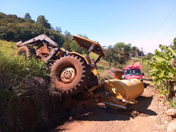 O Corpo de Bombeiros Militar foi acionado para atender um sinistro de trânsito do tipo queda de barranco envolvendo um trator.