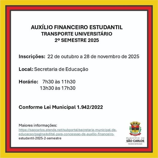 A Secretaria Municipal de Educação de São Carlos informa que estão abertas as inscrições para o Auxílio Financeiro Estudantil referente ao segundo semestre de 2025. O período de inscrição ocorre de 22 de outubro a 28 de novembro.