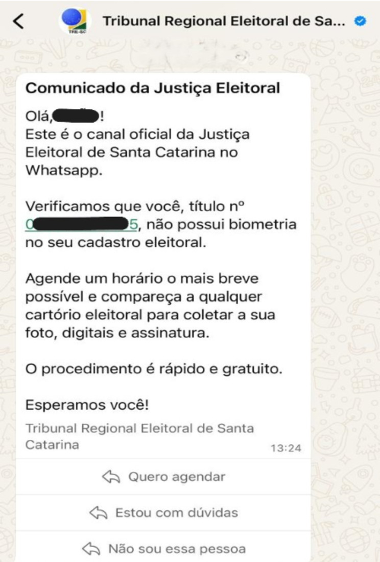 A Justiça Eleitoral de Santa Catarina criou uma nova forma de notificar eleitoras e eleitores que ainda não tenham realizado a coleta de dados biométricos. A partir desta segunda-feira (27), o Tribunal Regional Eleitoral de Santa Catarina (TRE-SC), vai disparar mensagens automáticas pelo WhatsApp por meio do número 0800-647-3888, contato oficial da JE catarinense neste aplicativo.
