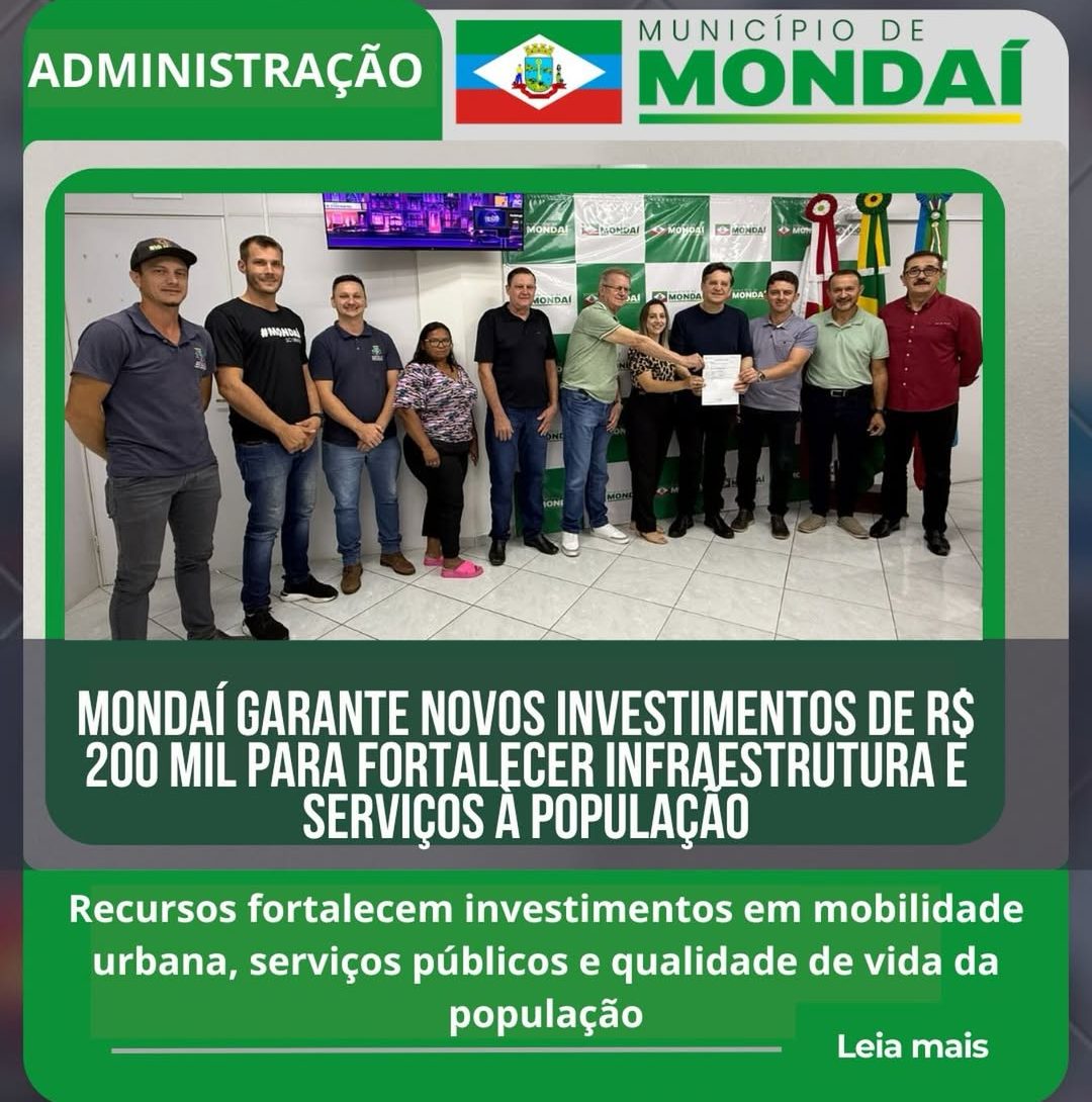 O Governo Municipal de Mondaí recebeu a confirmação de mais R$ 200 mil em recursos viabilizados pelo deputado estadual Jair Miotto, destinados à área de infraestrutura. Com esse novo aporte, o município passa a totalizar R$ 550 mil em emendas já garantidas, reforçando a capacidade de investimento em ações estruturantes.