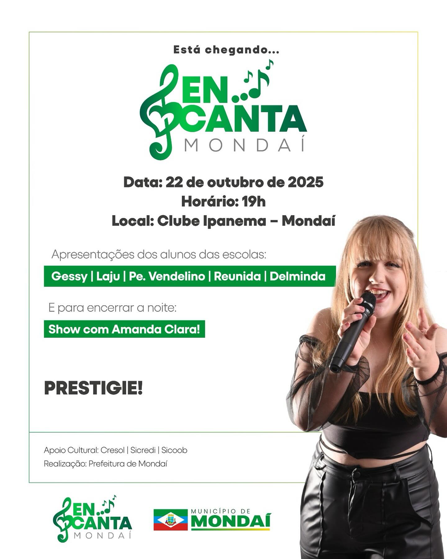 O Governo do Município de Mondaí, por meio da Secretaria de Educação e Cultura, realizará no dia 22 de outubro, às 19h, no Clube Ipanema, o Festival da Canção Escolar EnCanta Mondaí 2025. O evento busca valorizar a cultura local e oferecer aos alunos das escolas municipais um espaço de expressão artística e musical. O festival conta com o apoio cultural da Cresol, Sicredi e Sicoob.