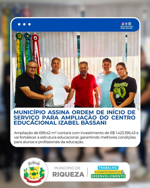 O Município de Riqueza assinou, na quarta-feira, dia 04 de março de 2026, a Ordem de Início de Serviço que autoriza o início das obras de ampliação do Centro Educacional Izabel Bassani, localizado na Rua 25 de Julho, esquina com a Rua Doze de Outubro, no Centro do município.