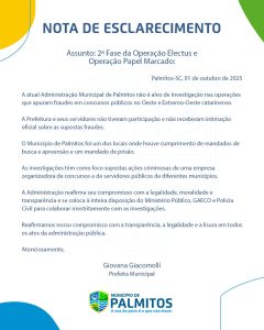 O município de Palmitos vem, por meio desta nota, prestar esclarecimentos à comunidade e à imprensa a respeito das notícias veiculadas nesta quarta-feira, 01 de outubro de 2025, sobre a deflagração da 2ª Fase da Operação Electus e Operação Papel Marcado pelo Grupo de Atuação Especial de Combate às Organizações Criminosas (GAECO) e Polícia Civil, para apurar fraudes em concursos públicos em municípios no Oeste e Extremo-Oeste catarinense.
