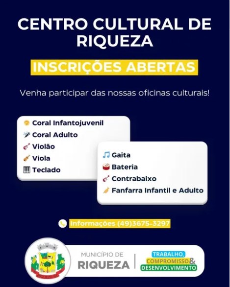 O Município de Riqueza, em parceria com o Centro Cultural de Riqueza, está com inscrições abertas para diversas oficinas culturais voltadas a crianças, jovens e adultos. A iniciativa busca incentivar o aprendizado musical, a descoberta de talentos e o fortalecimento da cultura local.