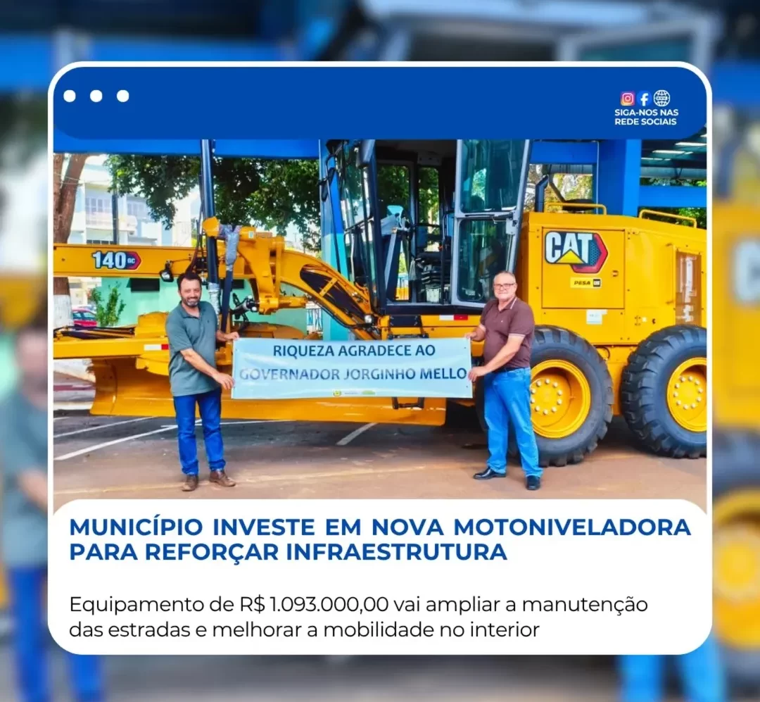 A Administração Municipal de Riqueza realizou a aquisição de uma motoniveladora para atuação nos serviços de infraestrutura e manutenção de estradas. O investimento total é de R$ 1.093.000,00.