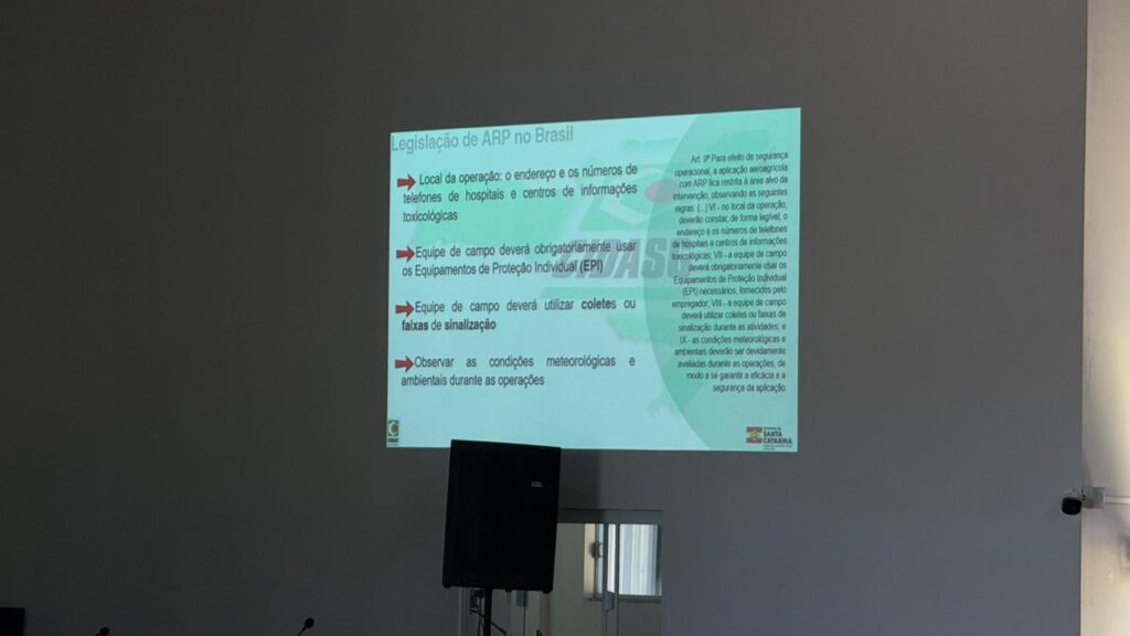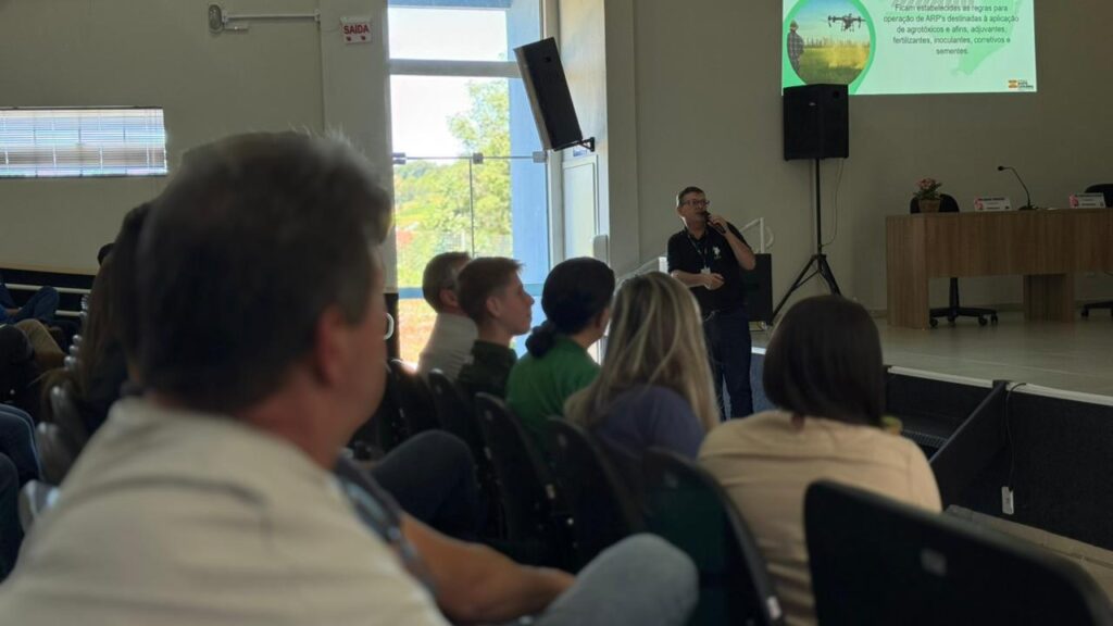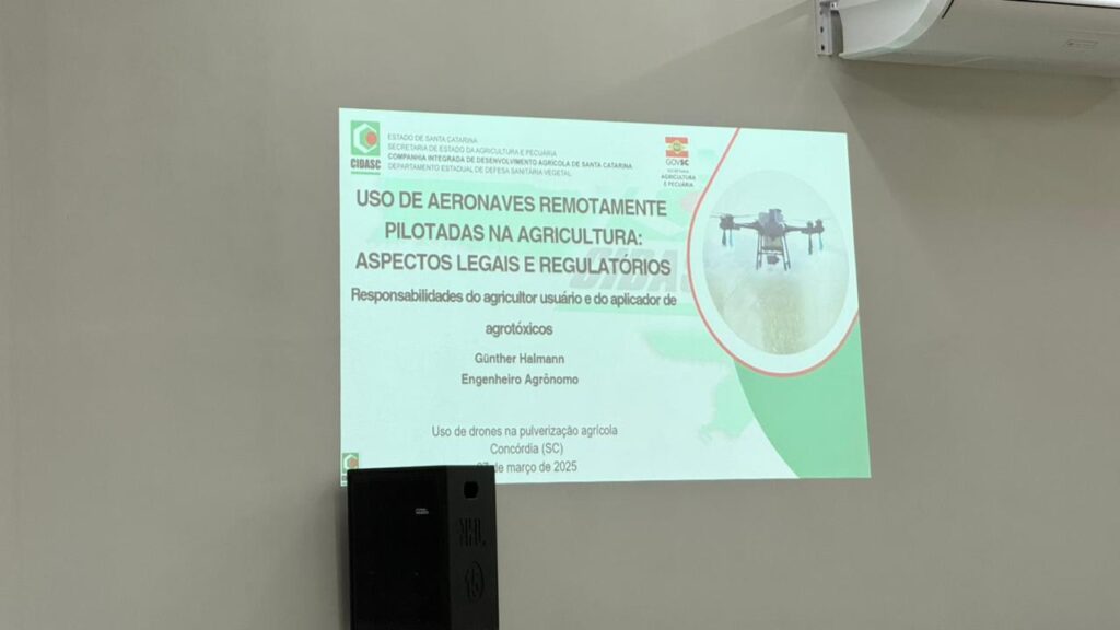 Günther Halmann, da CIDASC abordou as “responsabilidades do agricultor usuário e aplicador de agrotóxicos”, enquanto Maico Argenton e Mathias Mozer, da Farming Solutions, falaram sobre “como os drones estão transformando a pulverização agrícola”.