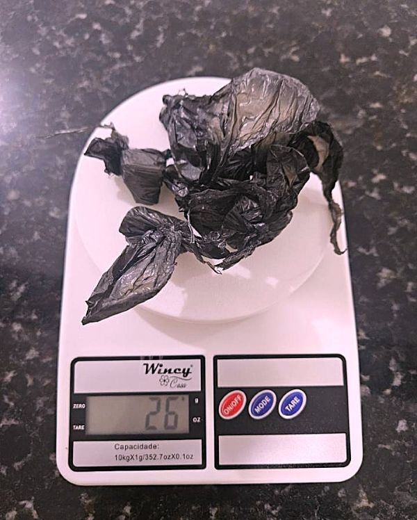 Em revista no automóvel, foram localizadas porções de cocaína escondidas no interior do veículo, totalizando cerca de 26 gramas da substância.