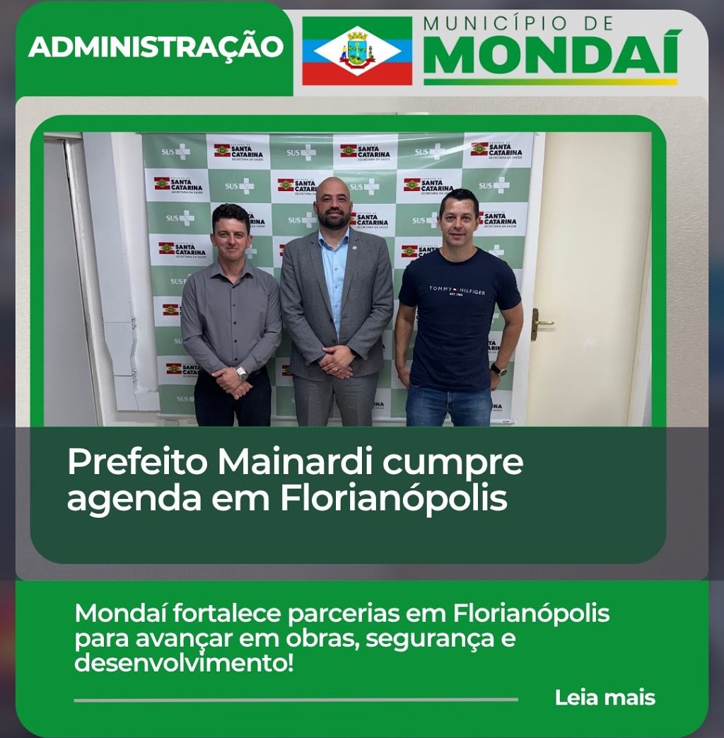 Nesta semana, o prefeito Elizandro Mainardi está em Florianópolis cumprindo uma importante agenda junto a secretarias e órgãos do Governo do Estado, acompanhado do secretário de Administração e Fazenda e coordenador da Defesa Civil de Mondaí, Juliano de Oliveira. As reuniões tiveram como objetivo buscar novas conquistas e investimentos para o município, reafirmando o compromisso da administração municipal com o desenvolvimento e o bem-estar da população mondaiense.