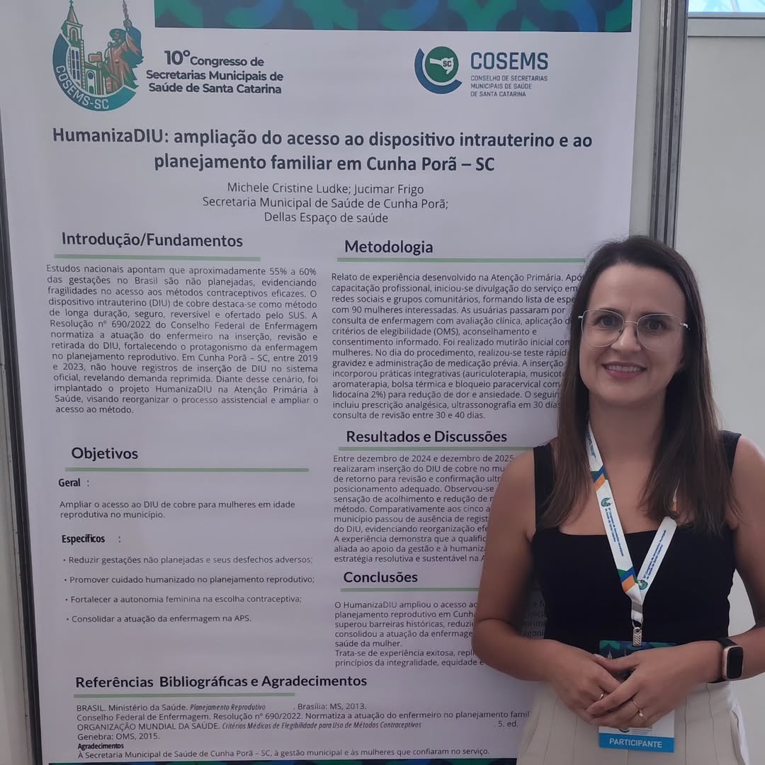 O projeto HumanizaDIU – ampliação do acesso ao dispositivo intrauterino e ao planejamento familiar, desenvolvido no município de Cunha Porã, foi selecionado para apresentação em formato de banner na Mostra Catarinense “Brasil, Aqui Tem SUS”, que integra a programação do 10º Congresso de Secretarias Municipais de Saúde de Santa Catarina.