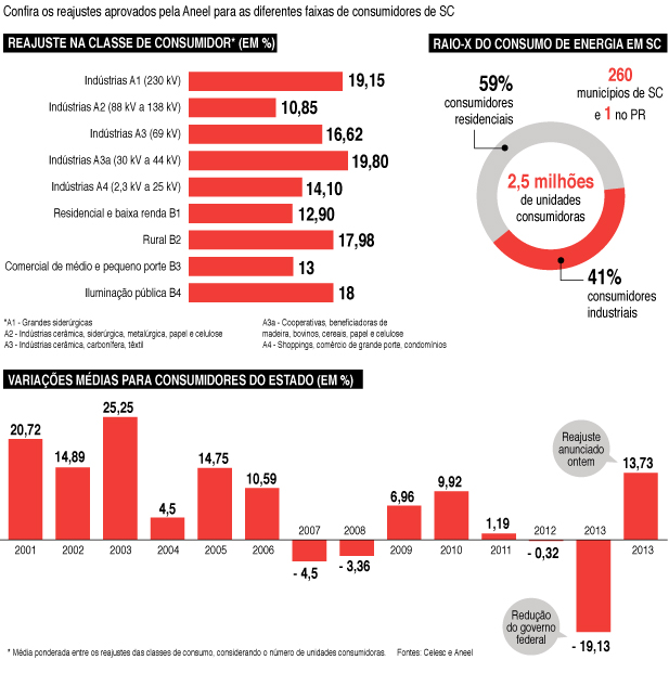 Para a indústria — dependendo da classe consumidora em que o setor se encaixa — o reajuste aprovado pela Aneel ficou entre 10,85% e 19,80%. Como o setor representa 41% dos consumidores da Celesc, o aumento terá impacto direto nos custos do setor produtivo do Estado, como afirma o presidente da Federação das Indústrias de Santa Catarina (Fiesc), Glauco José CÔrte.