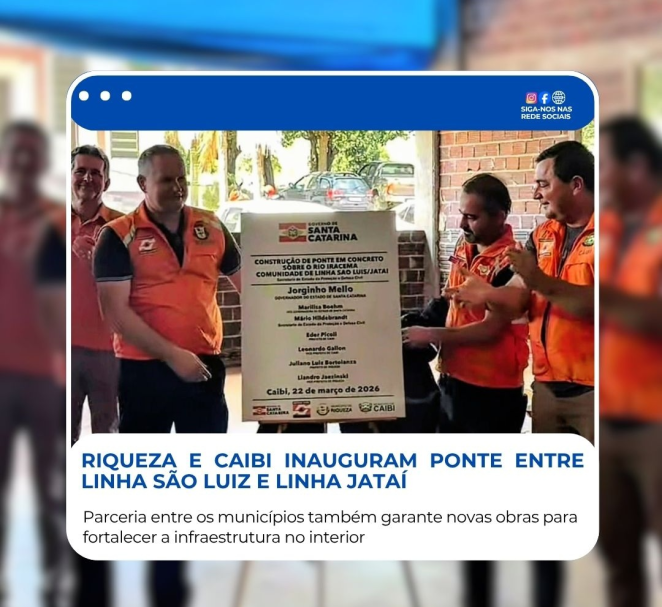 No domingo, 22, foi realizada a inauguração da ponte que liga a Linha São Luiz, em Caibi, à Linha Jataí, em Riqueza. O ato aconteceu durante evento na comunidade de Linha Bagé e marcou mais um importante avanço na parceria entre os dois municípios.