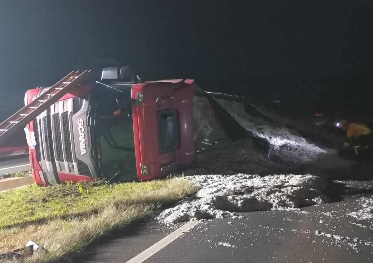 No local, a guarnição confirmou o tombamento de um caminhão Scania carregado com grãos de algodão. O motorista, homem de 29 anos, estava consciente e orientado, sentado na cabine lateralizada. Ele apresentava escoriações no membro superior esquerdo e não havia outras lesões aparentes. Após avaliação dos sinais vitais e procedimentos de atendimento pré-hospitalar, o motorista foi conduzido ao Hospital de Cunha Porã.