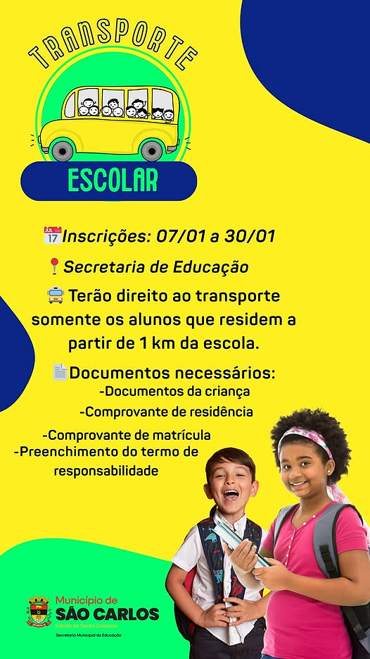 A Secretaria Municipal de Educação de São Carlos informa que estão abertas as inscrições para o Transporte Escolar. O período de inscrição segue de 7 a 30 de janeiro.