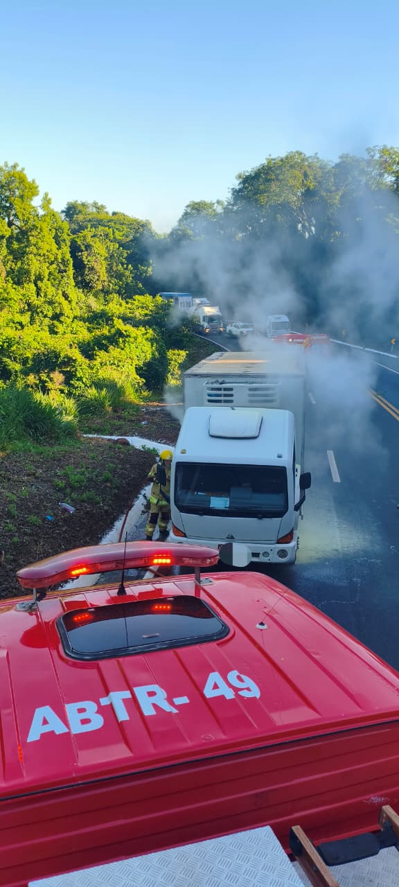 No local, os bombeiros encontraram o veículo às margens da rodovia, com fumaça saindo do compartimento do motor. O motorista relatou que conseguiu conter as chamas com o uso de extintor, com o auxílio de outros caminhoneiros que pararam para ajudar.